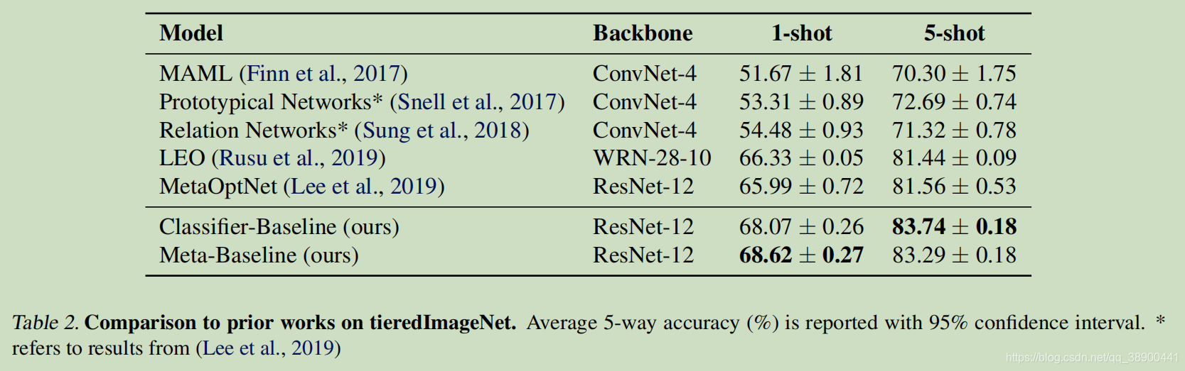 按照标准设置,我们在miniImageNet 和 tieredImageNet上进行实验,结果分别如表1和表2所示。