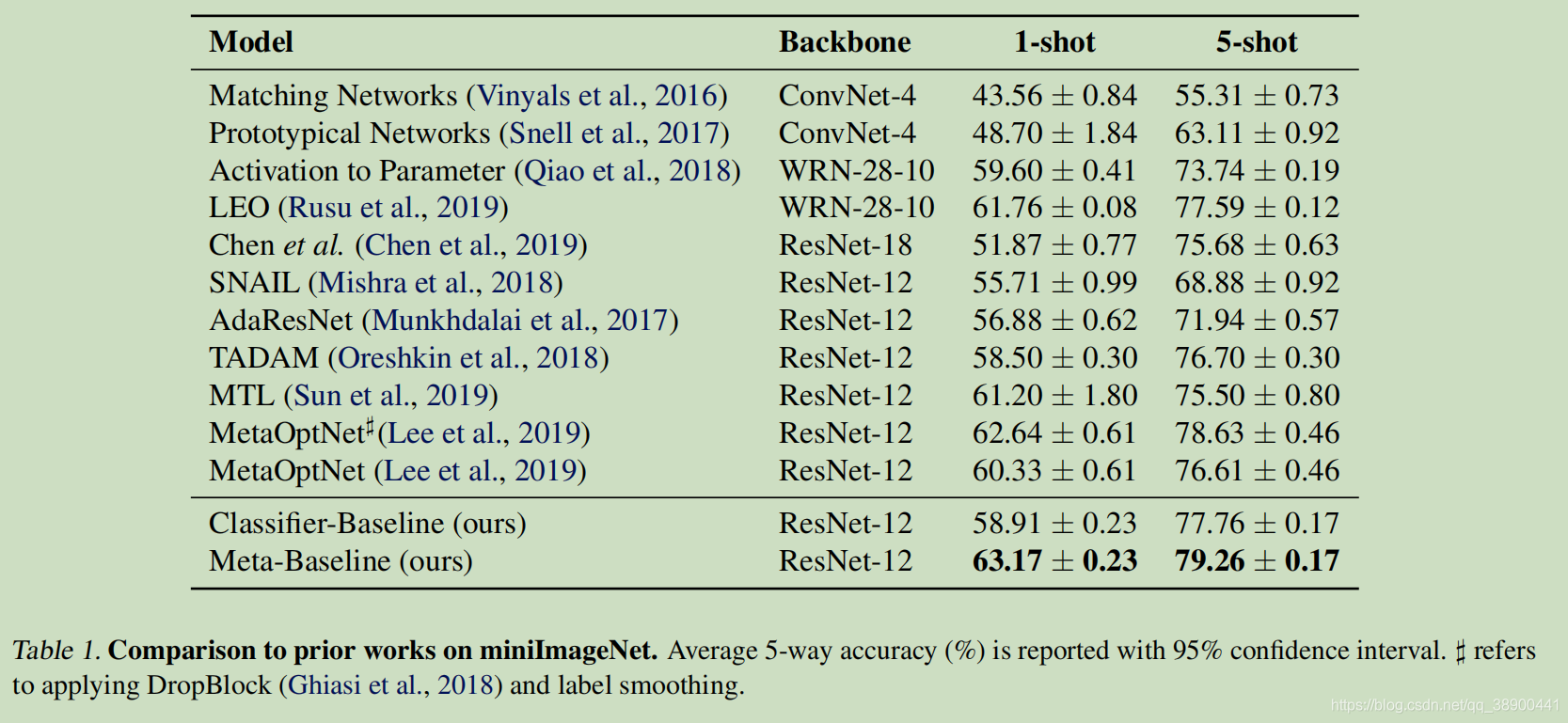 表1。 比较以前的作品在miniImageNet。 平均5类精度(%)报告为95%置信区间。#参考应用DropBlock(Ghiasi等人,2018年)和标签平滑。