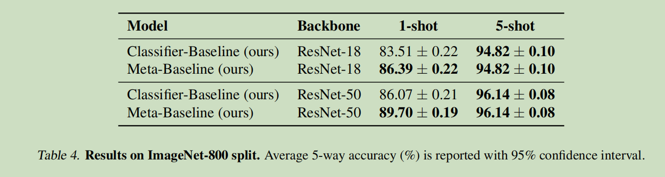 我们在一个大规模的数据集上进一步评估我们的方法Image Net-800。在这个大规模的实验中,我们发现冻结批量归一化层(Ioffe&Szegedy,2015)是有益的,结果如表4所示。从结果中,我们观察到,在这个大型数据集中,很大程度上单样本Meta-基线改进了分类器-基线,虽然它没有提高5样本的性能。
