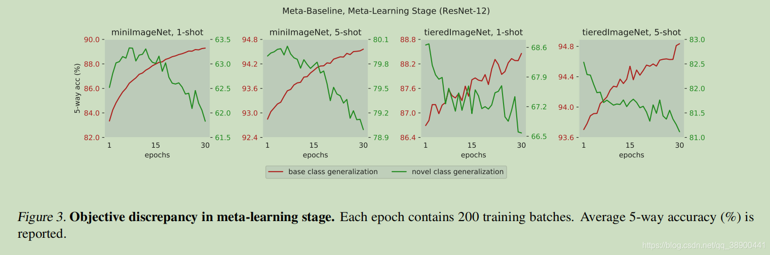 图3展示了miniImageNet 和 tieredImageNet上Meta-Baseline的训练过程。 我们观察到,在元学习阶段,当基类泛化性能增加时,表明模型对其目标的学习更好,新类泛化性能迅速开始下降。我们还对Image Net-800数据集的实验进行了类似的观察,如图1b所示。 这表明学习成绩的下降很可能是元学习阶段的客观差异造成的,即元学习模型在基类上迅速变得特定,这对新类有负面影响。