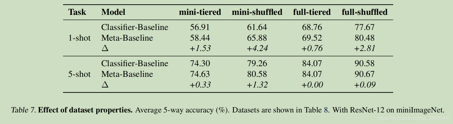 从我们在表1,2,4,7中的实验结果中,我们观察到,在5次样本中元学习阶段的改善远小于1次样本的改善。 我们假设 这是因为当有更多的样本时,取平均特征成为估计分类器-基线中的类中心的一个更强的选择,因此元学习的优势变得更小。4