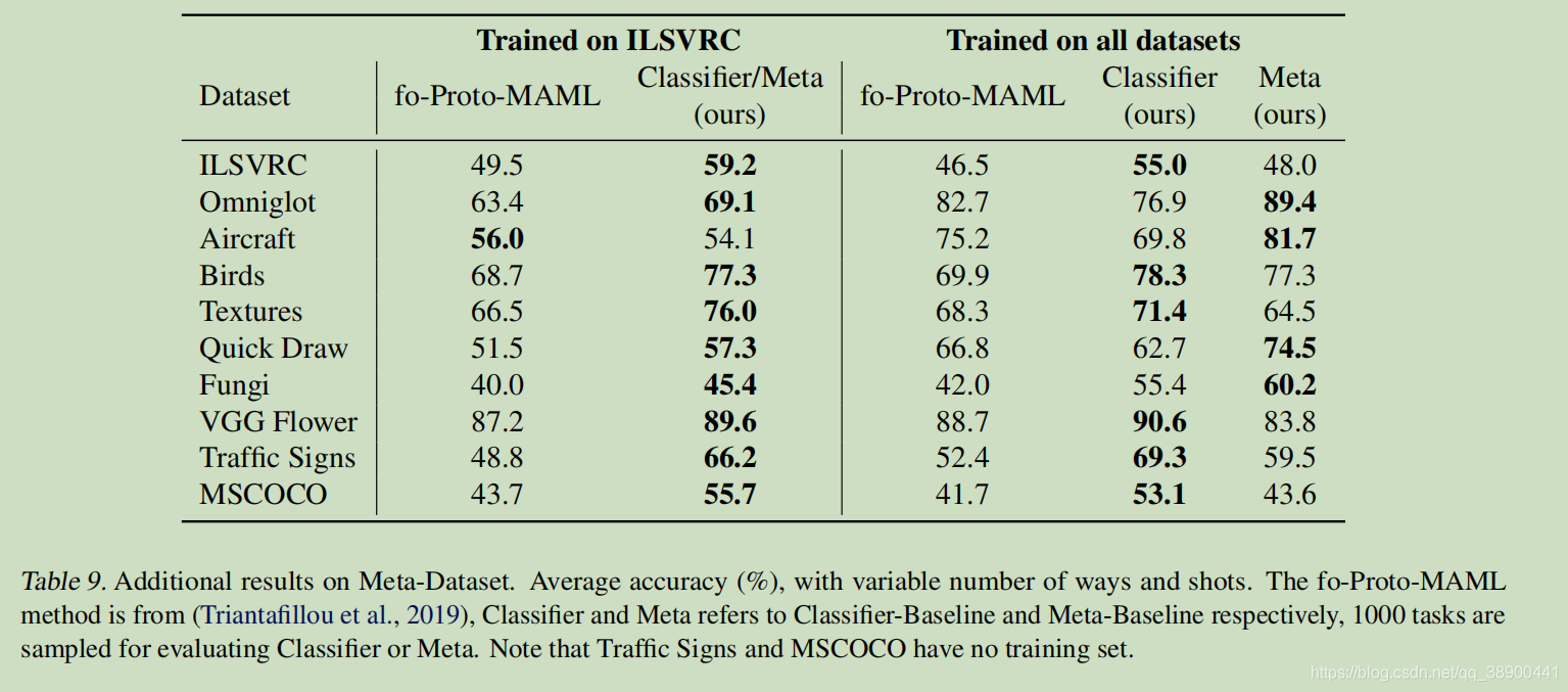 Meta-Dataset(Triantafillou等人,2019年)是为小样本学习提出的新基准,它由用于训练和评估的不同数据集组成。使用ResNet-18作为骨干,具有原始图像大小在126×126中,在输入网络之前,调整大小为128×128。 对于预训练阶段,我们应用标准的训练设置,类似于我们在Image Net-800中的设置。 关于元学习 阶段,对模型进行5000次迭代训练,每次迭代有一个任务。