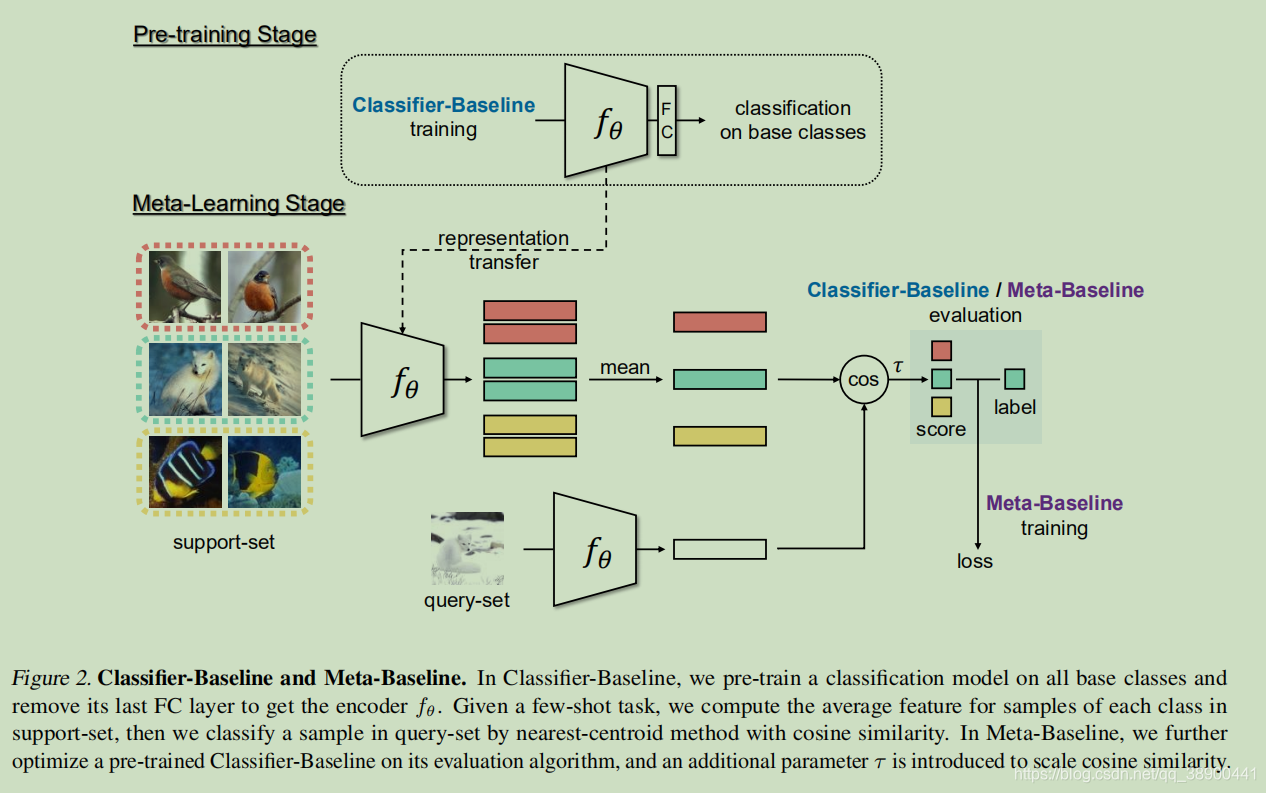 图2。 分类器-基线和Meta-基线。 在Classifier-Baseline中,我们在所有基类上预先训练一个分类模型,并删除其最后一个FC层以获得编码器fθ。 给定一个小样本任务,我们计算了支持集中每个类的样本的平均特征,然后用具有余弦相似度的最近质心方法对查询集中的样本进行分类。 在Meta-Baseline中,我们进一步选择在其评估算法上对一个预先训练的分类器-基线进行了成像,并引入了一个额外的参数τ来缩放余弦相似度。