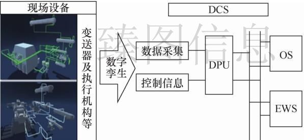 企业为了模拟仿真和警报构建数字孪生,可以减少非故障的停车时间,同时持续降低员工的工作强度。智能发电站也可以应用数字孪生体,提高发电站的智能化水平,达到降低效率、节约能源的目的。发电站是技术密集型、高度自动化的现代生产企业,具有应用数字孪生的良好基础,从数字孪生的内涵和DCS的体系结构来看,部分生产过程可以视为通过DCS实现的低级数字孪生。DCS通过I/O输入模块从物理现场收集信号,在DCS中对生产流程建模,根据物理模型的控制要求对收集到的信号进行适当的控制参数,最后通过I/O输出模块进行现场执行控制。生产工艺数字孪生如下图所示。