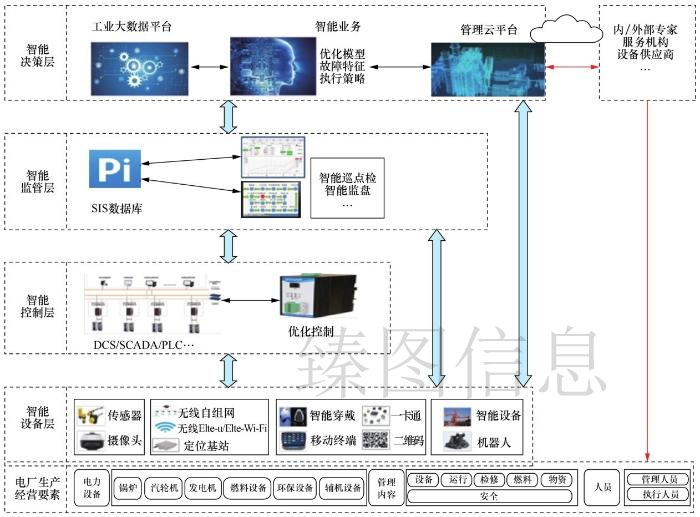 从目前对智能发电厂的研究和推进情况来看,研究人员对于智能发电厂的定义描述不同,体系结构上也有一些不同的理论观点,实现方式上更有差异,但对智能发电厂的核心要求已经有了初步的共识。也就是说,通过智能化、数字化、信息化,综合应用网络、大数据资源。充分发挥智能系统强大的分析处理能力,标准化生产管理流程,提高生产管理水平,掌握生产管理趋势,形成一系列智能生产管理模式,提高能源利用效率。智能发电站完全符合电厂自动化的发展趋势。从近几十年发电厂自动化技术的发展历史角度来看,发电厂自动化从现有仪表控制、分布式控制系统控制、工厂级监控资讯系统应用到电脑技术的持续发展,现场控制发电厂、自动化发电厂、数字发电厂、发电厂的生产率水平逐步提高。进入数字时代后,“网络”、“大数据”、“人工智能”等新的信息技术等将进一步提高发电厂的自动化水平,使发电厂智能化发展,实现“本质安全、高效清洁、人机合作、智能决策”的发电厂价值目标。如此智能的发电站是一个全面、整体、多维的生产经营管理系统。与管理学理论一起,智能发电站可以分为智能设备层、智能控制层、智能管理层和智能决策层四个层面。智能设备层和智能控制层侧重于具有全面意识和协作最优化功能的执行。智能监管层和智能决策层侧重于具有预测警报和科学决策功能的管理,如下图所示。