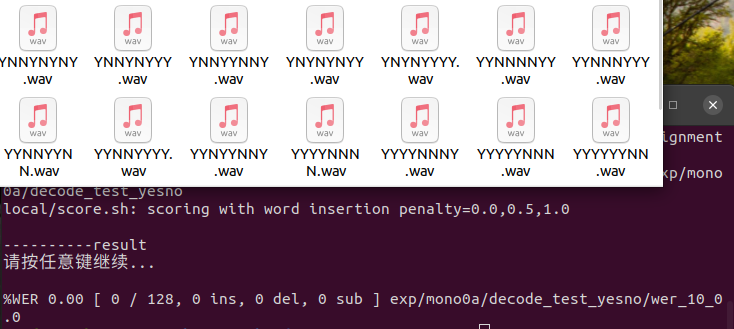 首先将kaldi里面yesno音频目录的文件全部清除,然后把自己录制的wav格式的文件复制到yesno音频目录。