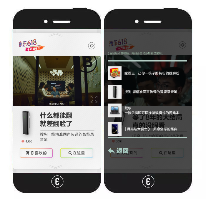内容简介:该视频类H5只有一个loading页面和一个主页面,用户可在主页面进行4种操作:①上下滑动屏幕,切换视频及相应的产品简介;②看到自己喜欢的产品时,点击屏幕进行收藏;③点击“你喜欢的"按钮查看收藏的产品列表;④点击“在这里”按钮跳转至京东的产品购买页。