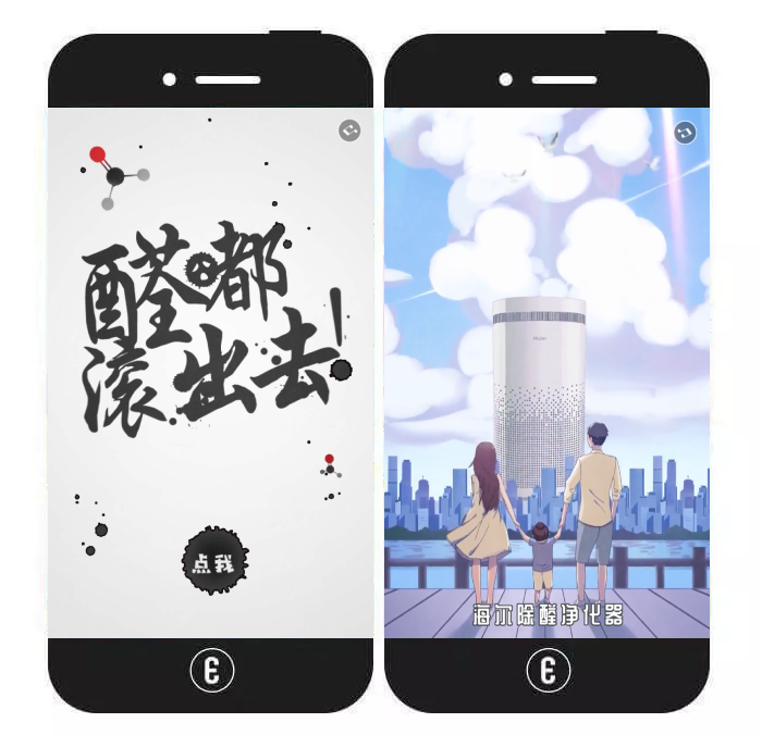 内容特色:该视频类h5主要围绕“醛都滚出去”而展开,视频先指出甲醛的危害,进而针对性地展示海尔空气净化器的各种优势。作品最后,用户还可根据提示跳转至这款产品的购买页。
