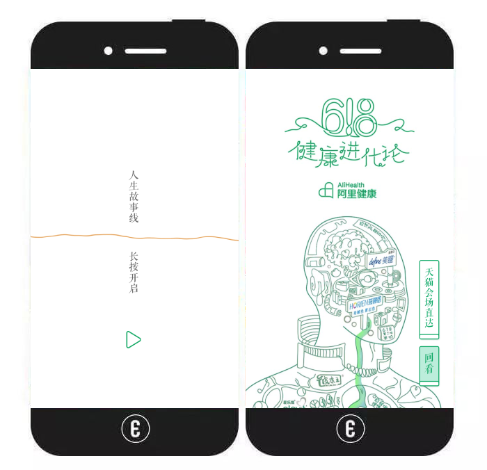 内容特色:该视频类H5主要通过一根线不断勾勒出一个人出生、上学、恋爱等成长过程,继而引出“健康”这个主题,并自然过渡到阿里健康的618“健康进化论”活动。在观看视频的过程中,用户需长按屏幕,否则视频将停止播放并将画面定格在首页。视频结束后,用户还可滑动长页面并根据提示按钮了解更多信息。