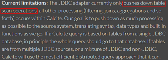 换句话说,calcite为了能够适配各类数据源,需要添加适配器来对接,适配程度和适配器完善程度相关,例如JDBC adapter当前就存在一定限制,只能下推scan到底层JDBC源,其他操作无法下推: