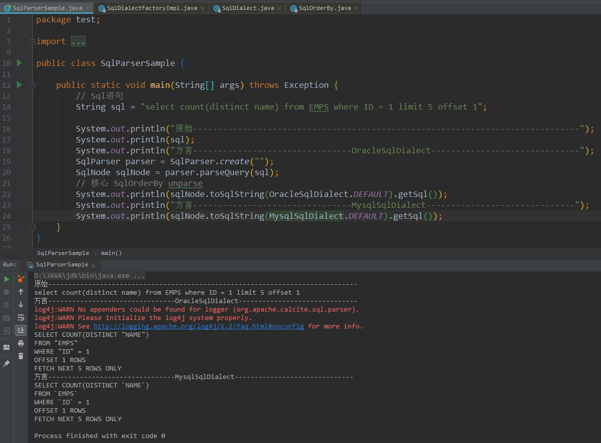 从这个demo可以看到sql经过不同方言类转换得到的sql均不相同,debug sqlNode.toSqlString方法即可看到sql组装的过程