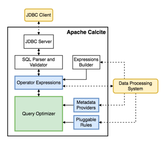 也正是因为Calcite本身与数据存储和处理的逻辑无关,所以这让它成为与多个数据存储位置(数据源)和多种数据处理引擎之间进行调解的绝佳选择。