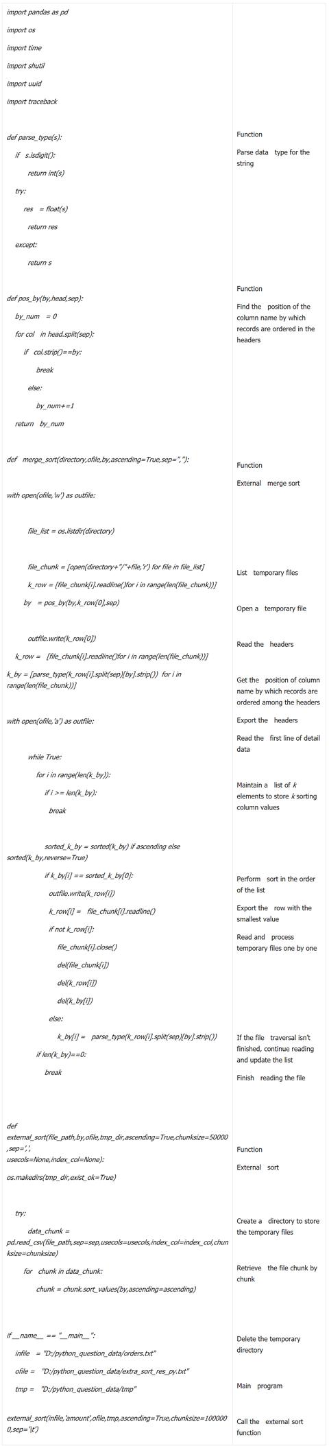To sort the above file by amount in ascending order, I write a complete Python program of implementing the external sorting algorithm: