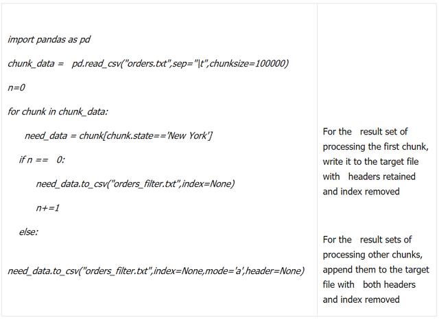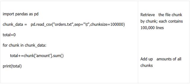 Since a big file can’t be loaded into the memory at once, we often need to retrieve it line by line or chunk by chunk for further processing. Both Python and pandas support this way of retrieval, but they don’t have cursors. Because of the absence of a cursor mechanism, we need to write code to implement the chunk-by-chunk retrieval in order to use it in functions and methods; sometimes we even have to write code to implement functions and methods. Here I list the typical scenarios of big file processing and their code examples to make you better understand Python’s way of dealing with them.
