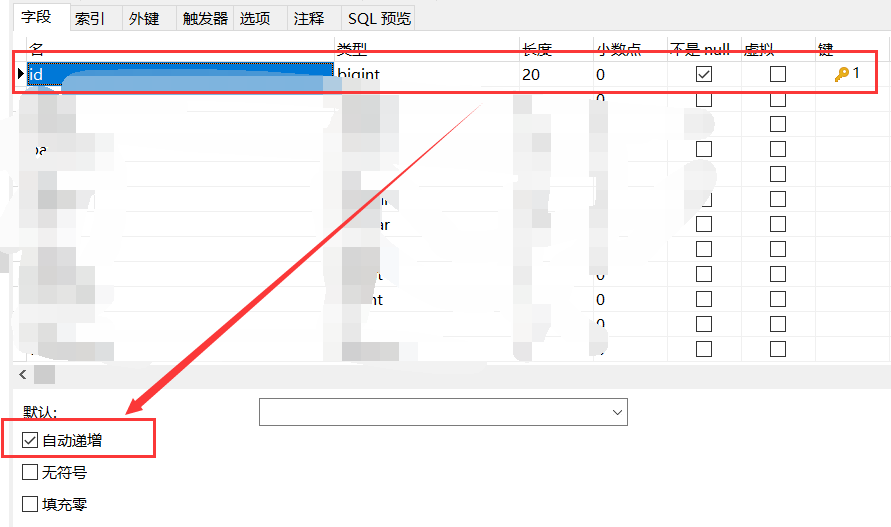 第一步:检查自己的id是否是int类型,因为我自己设置的是string类型,所以在使用Navicat 时找不到自增的选框