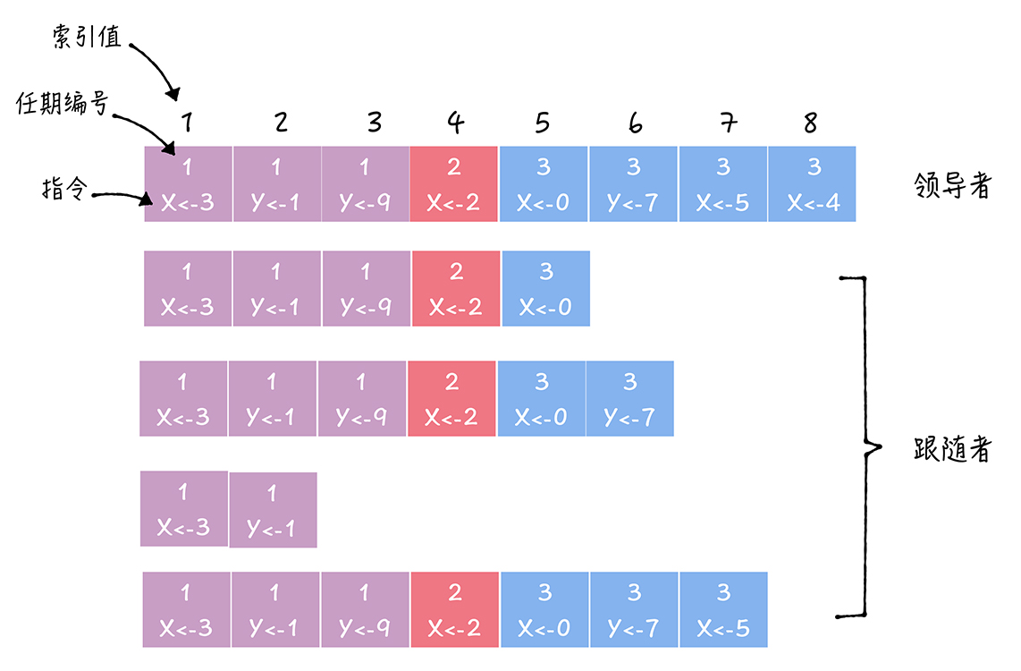 - 领导者通过日志复制 RPC,复制并更新覆盖该索引值之后的日志项(也就是不一致的日志项),最终实现了集群各节点日志的一致。