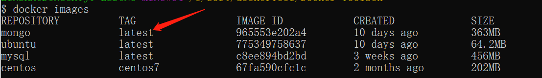 在上图中可以看到我们已经安装了最新版本(latest)的 mongo 镜像。