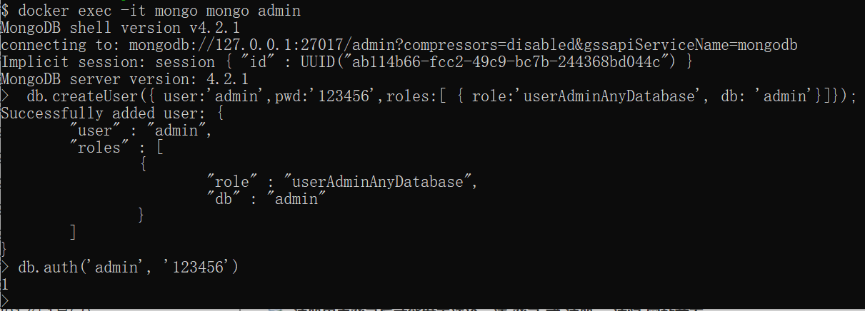 > db.createUser({ user:'admin',pwd:'123456',roles:[ { role:'userAdminAnyDatabase', db: 'admin'}]});
