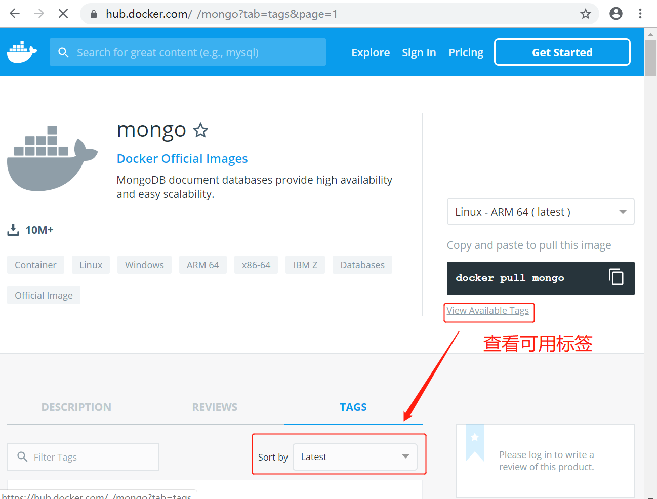 可以通过 Sort by 查看其他版本的 MongoDB,默认是最新版本 mongo:latest。