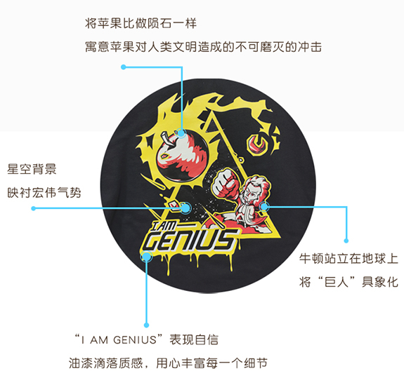 因此我们这次将这位“老朋友”和他的苹果印在了衣服上。
