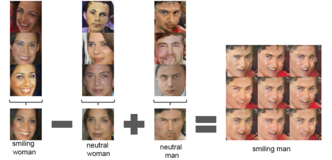 DCGAN 还有一个重要的创新之处在于将矢量加法引入到图像生成中,如下图所示: