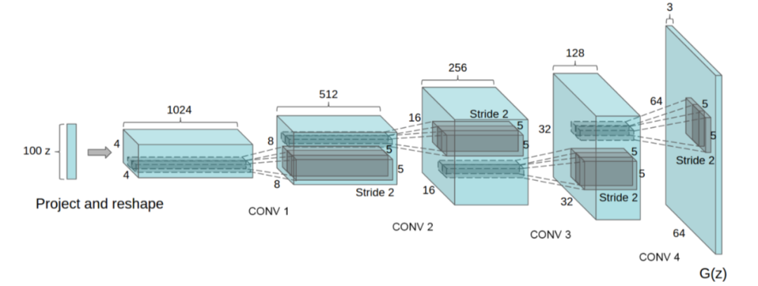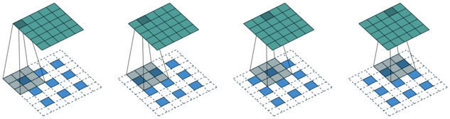 生成器是低维向量到高维向量是一个反卷积过程,反卷积又名转置卷积和微步卷积,卷积和反卷积两者的区别在于 padding 的方式不同,看看下面这张图片就可以明白了: