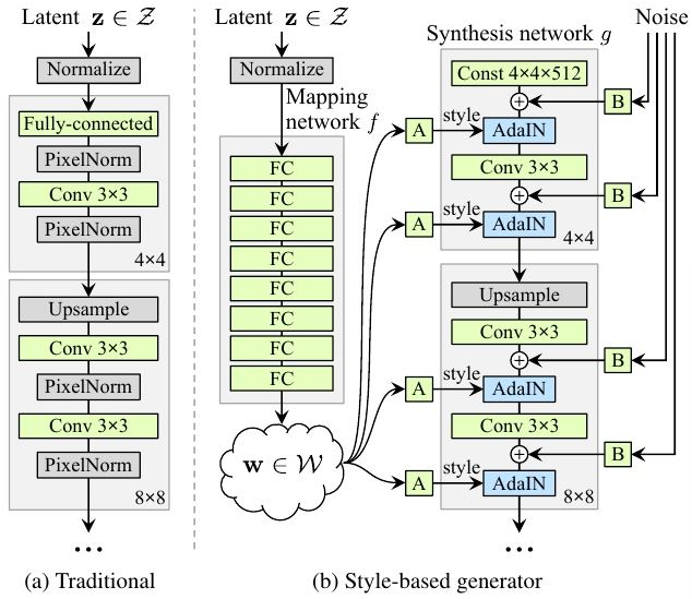 StyleGAN 提出了一个新的生成器框架,号称能够控制所生成图像的高层级属性,如发型、雀斑等;并且生成的图像在一些评价标准上得分更好,作为无监督学习的一种 GAN,它能够从噪声生成高分辨率的高清图像。具体的算法框架原理图如下所示: