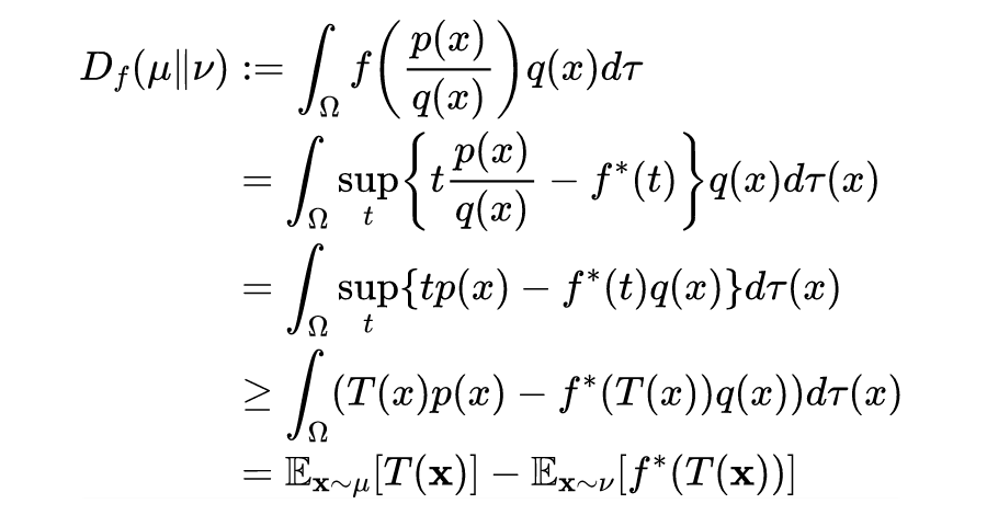 为了估计样本的 f- 散度可以使用 f 的凸对偶,具体的推导公式如下所示: