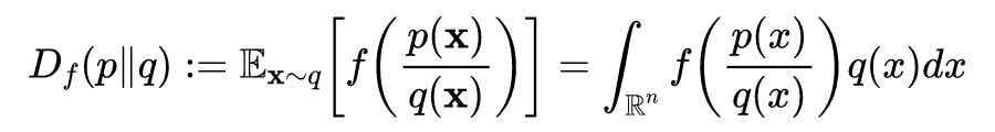 但是其实能将所有我们熟知散度归结到一个大类那就是 f- 散度,具体的定义如下所示: