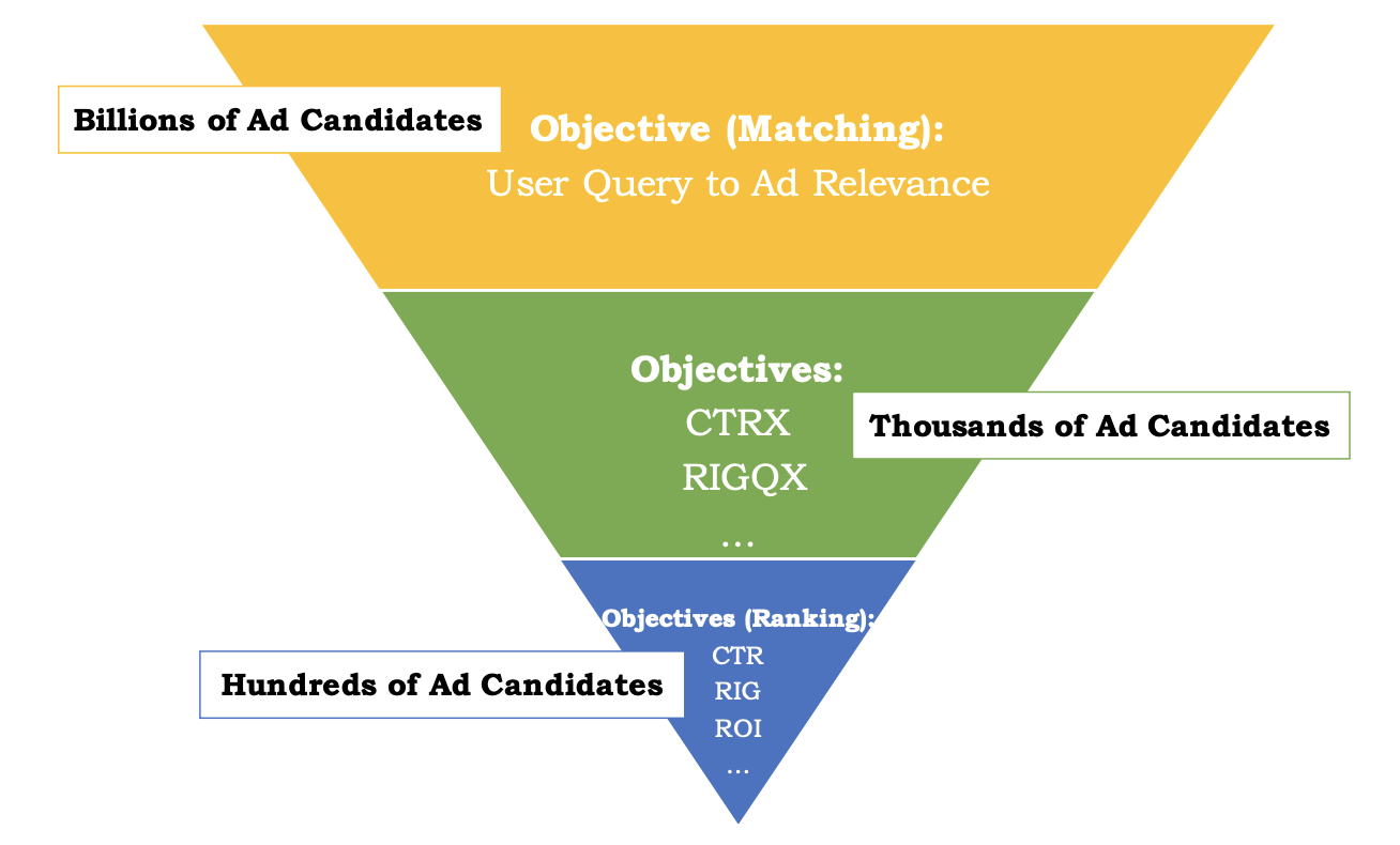 这个架构从速度的角度考虑运行的完全没有问题,但是从目标的角度考虑,就有问题了,问题在于最前面的Matching算法跟最后的Ranking算法的目标不一致,这就会导致在最后排序的时候,可能最相关的广告并不在候选集合中,即便排的再好也无济于事。