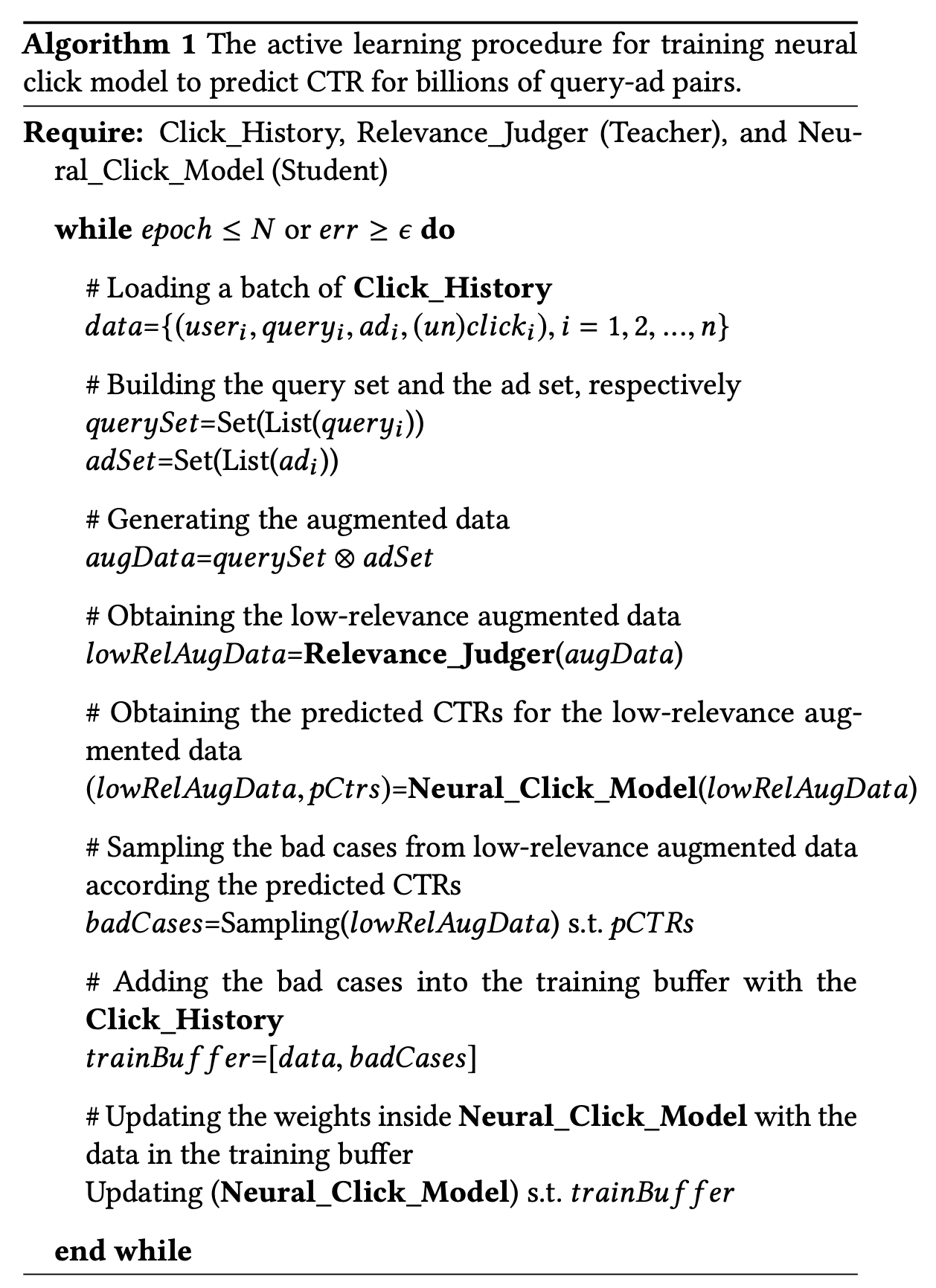 在数据增强这一步,首先,载入点击历史,得到ad-query对,然后找到ad的集合和query的集合,去做笛卡尔集。然后teacher模型给每一个query-ad对一个评分,用一个threshold来把低相关度的query-ad对找到。再把这些query-ad对fed给CTR模型,找到低相关度高CTR的数据作为bad case。