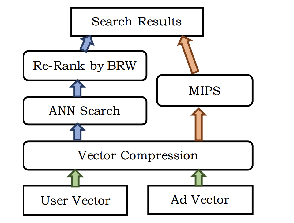 因而论文采用了ANN去做近似搜索,在上面的模型中,user query被embedding成三个向量,而ad也被embedding成三个向量,然后它们做内积再输入给softmax层,这就使得ANN搜索称为了可能,即直接使用embedding后的向量去做内积然后排序进行搜索。