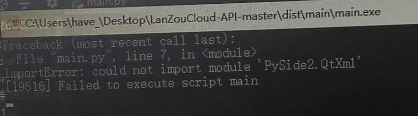 打包完成后再次运行.exe文件,控制台窗口一闪而过,出现 ImportError:could not import moudle 'PySide2.QtXml' , 如下图: