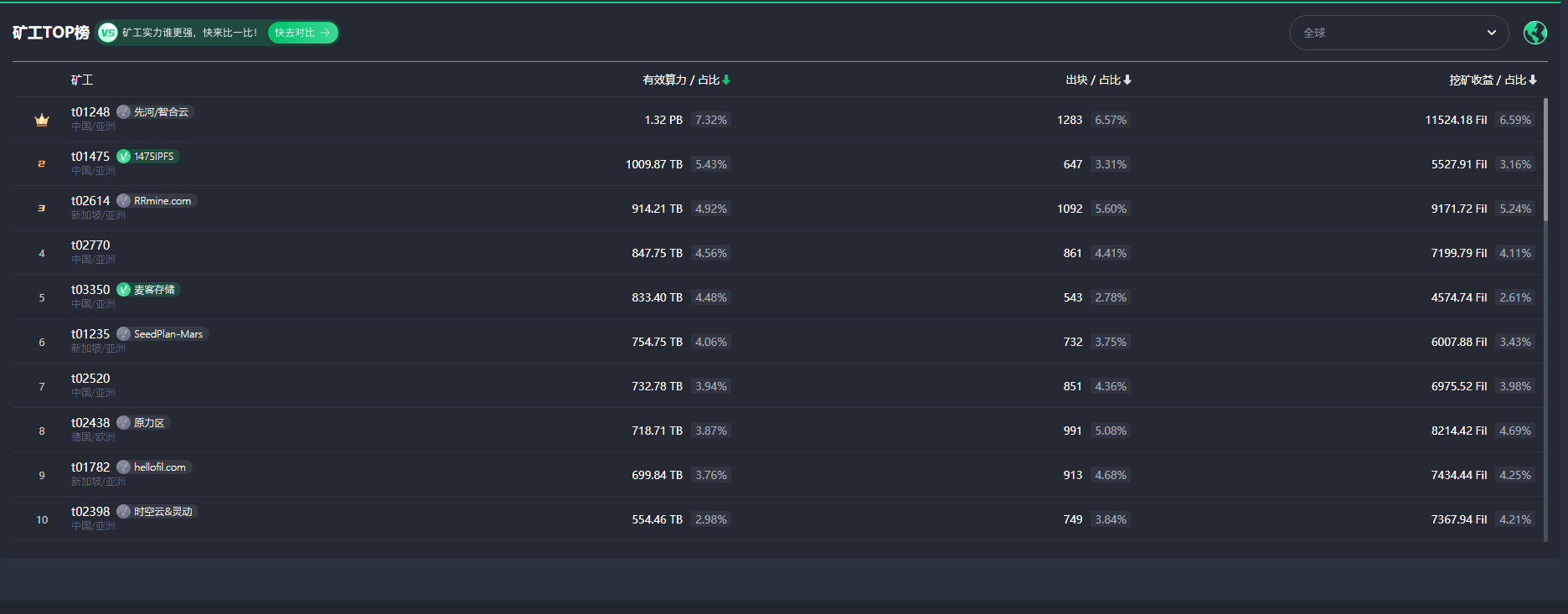 本次大矿工测试为期三周,奖励FIL高达为410万枚,全球六大洲的矿工都参与其中。主网还未上线,测试中的算力排名是当前最客观、最有说服力的实力证明。
