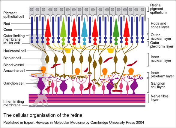 下图是视网膜十层结构的一个示意图,这十层结构在图中上而下分别是:色素上皮层,视锥、视杆细胞层,外界膜,外颗粒层,外丛状层,内颗粒层,内丛状层,神经节细胞层,神经纤维层,内界膜。其中负责接受光信号(也就是网络的输入层)的是视锥、视杆细胞(感光细胞)层(Rods and cones layer)。一个有趣的现象是,光线在到达该层时(该层的神经元称为:感光细胞)要首先穿过视网膜的其余八层。二者八层不是完全透明的哦,其中部分层次分布有为视网膜提供营养的血管(不透明),可是我们从来感觉(看)不到血管的存在导致的视野中的阴影。光信号在到达感光细胞前经过其它视网膜的其它结构是脊椎动物与非脊椎动物视网膜结构的重要差别。