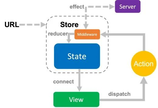 State是负责保存整个应用状态,View是React组件构成的视图层,Action是描述事件的对象。connect方法是绑定 State 到 View的函数,使得View层的组件可以动态监听State中的属性,同时可以通过dispatch方法负责将Action发送至State触发状态改变。触发状态改变有两种类型的函数:effect函数和reducer函数。前者会与服务端进行数据通信,可以处理异步动作;后者处理同步动作,并直接更新State。