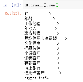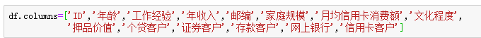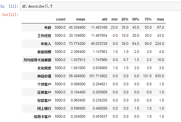 (1)连续型特征:年龄和工作经验的均值与中值位数比较接近,说明二者分别比较均匀,但它们的标准差不低,说明年龄和工作经验的分布比较广;年收入、月均信用卡消费额和押品价值的均值都比中位数高,说明它们都是呈右偏分布,存在极大值;其中年收入和押品价值标准差非常大,右偏程度很高;尤其是押品价值的中位数为0,可见50%以上的客户没有住房抵押。