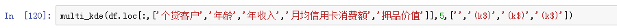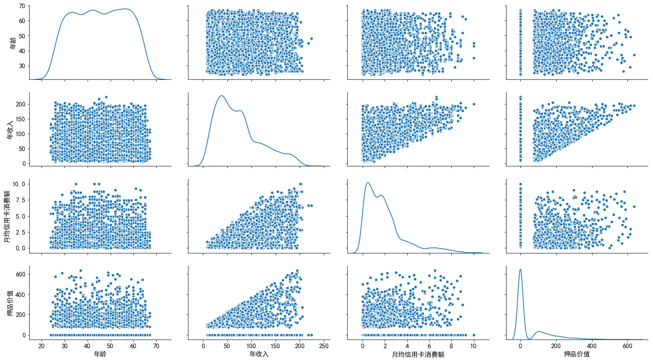 (1)数值分布分析:该行客户总体上年龄集中在30岁到60岁之间,但36和46岁的客户要比相邻年龄的客户少一些;工龄集中在7到34年;年收入集中在4万到7.5万美元间;月均信用卡消费额集中在0.5到2千美元间;押品价值集中在0值上,说明绝大部分客户没有住房抵押,但押品价值的核密度在100万美元处有一个极值,说明有住房抵押的客户大部分押品价值都在10万美元左右。