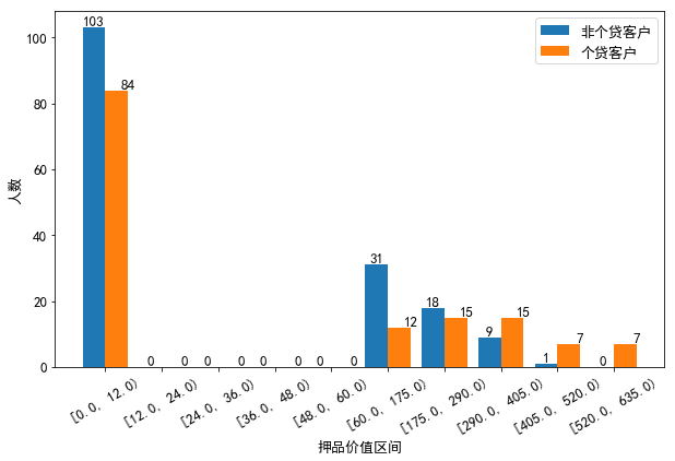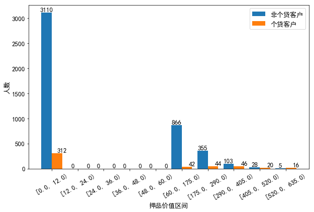 (4)在押品价值的分布上:个贷和非个贷客户的押品价值都集中在0值附近,进一步对押品价值分箱处理后发现,个贷和非个贷客户中绝大多数都没有住房抵押(押品价值为0),且个贷客户中有住房抵押的其押品价值在29万到40.5万美元之间的最多,并且当押品价值在6万到40.5万之间时,随着押品价值的升高个贷客户的数量在增多,而非个贷客户的数量在减少。