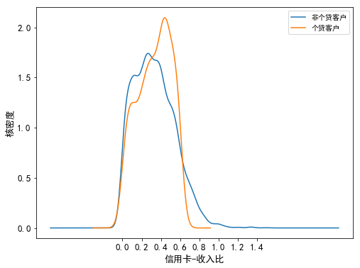 分析:非个贷客户的信用卡消费额占其收入的比重集中在20%左右,而个贷客户的信用卡消费额占其收入的比重集中在40%左右;同时,在20%到40%这一区间内,非个贷客户的核密度曲线急剧下降,而个贷客户的核密度曲线急剧上升并达到峰值,可见信用卡-收入比在30%到40%之间的客户办理个贷业务的倾向最强。但当信用卡消费额占收入的比重超过65%以后,个贷客户数量的下降幅度要大于非个贷客户,可见虽然大部分非个贷客户对信用卡的使用较为保守,但也存在小部分不理性使用信用卡的客户。
