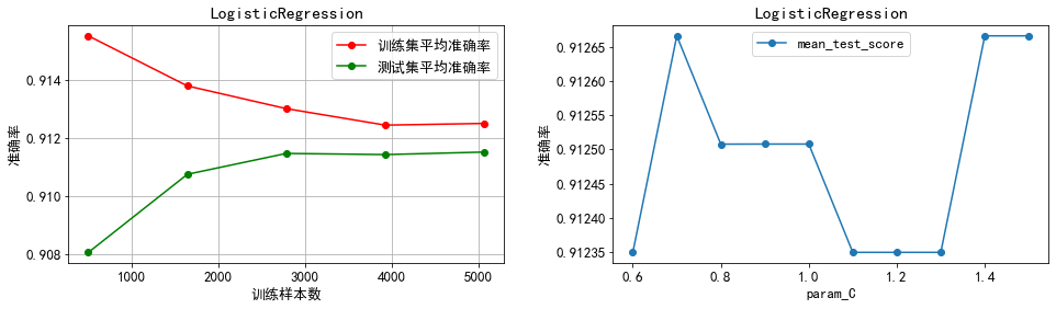 3)逻辑回归:最优正则化系数的倒数为1.3,且通过学习曲线可以看出模型准确率在正则化系数倒数为1.3处取到最值,因而不需要再进行调参。