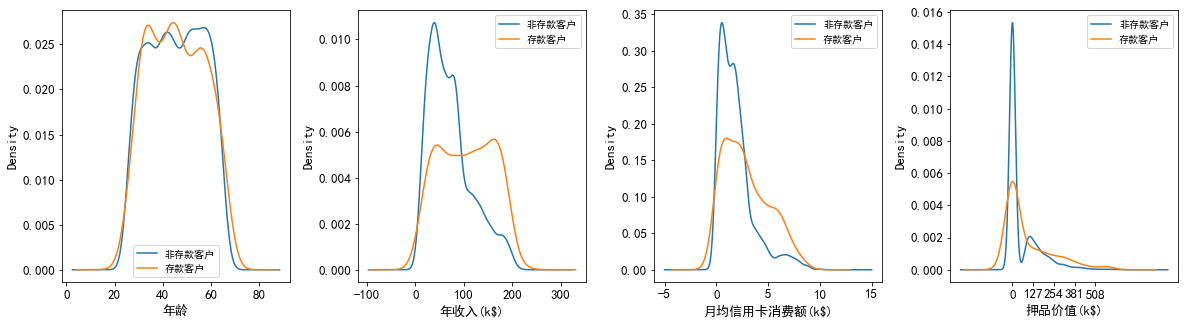 1.1 存款和非存款客户在年龄、年收入、月均信用卡消费额和押品价值上的分布差异