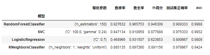 分析:可以看出,逻辑回归、支持向量机和随机森林分类器的auc都达到了0.95以上,但其中逻辑回归的查准率和预测正确率不够理想,不过这并不妨碍该模型的使用价值,因为本业务是要尽可能多得识别出潜在的个贷客户,因而相比于查准率本业务更看重查全率;而k近邻分类器虽然auc低于0.95,但其预测正确率并不低;所有模型中预测性能最好的是随机森林分类器,其f1得分和预测正确率都很高,且auc高达0.9984。