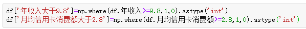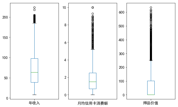 分析:通过箱线图可以看出,年收入、月均信用卡消费额和押品价值这三个字段呈明显的右偏分布,可采用对数变换修正数据倾斜,使其服从类正态分布;但由前面的描述性统计分析可知,押品价值的分布不是连续的,且虽然存在极大值但有住房抵押的客户只占少数,可以预见即使对押品价值进行函数变换也无法得到理想的效果,因而最终只对年收入和月均信用卡消费额进行对数变换,而对押品价值的分布不予处理。