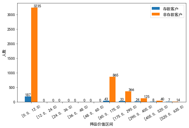 (4)在押品价值的分布上:存款和非存款客户的押品价值都集中在0值附近,进一步对押品价值分箱处理后发现,存款和非存款客户中绝大多数都没住房抵押(押品价值为0),而有住房抵押的存款客户其押品价值在6万美元到17.5万美元间的最多,有住房抵押的非存款客户其押品价值在10万美元左右的最多(其核密度曲线在10万美元处有一极值),同时随着押品价值的升高存款和非存款客户的数量都越来越少。