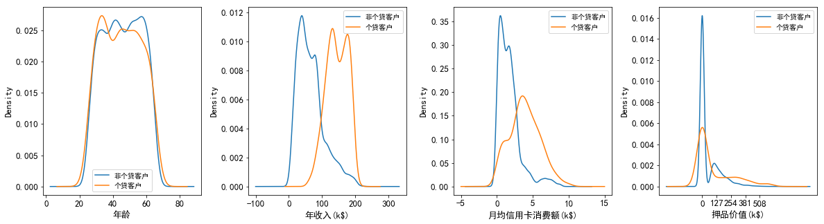 2.1 个贷和非个贷客户在年龄、年收入、月均信用卡消费额和押品价值上的分布差异
