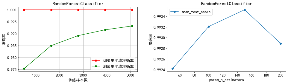 5)随机森林分类器:最优决策树个数为100,且通过学习曲线可以看出决策树个数向100两侧变化并不能带来模型准确率的提高,因而不再进一步调参。
