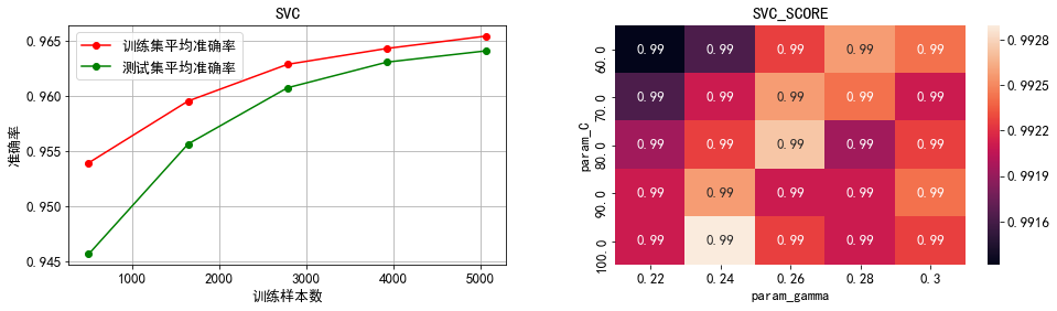 4)支持向量机:通过热力图可以看出,矩阵中最优系数搭配组合(误分类惩罚系数100,核函数系数0.26)周围看不出明显的能使模型准确率提升的参数变化趋势,因而不再进一步调参。