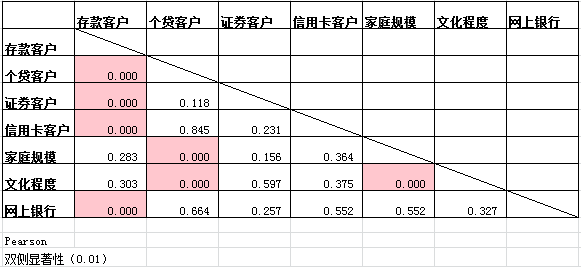 (2)通过皮尔逊相关性检验可以得出,家庭规模和文化程度与是否为存款客户之间没有显著相关性;是否为证券客户、是否为信用卡客户、是否使用网上银行与是否为个贷客户之间没有显著相关性;是否为证券客户与是否为信用卡客户、家庭规模、文化程度和是否使用网上银行之间没有显著相关性;是否为信用卡客户与家庭规模、文化程度、网上银行之间没有显著相关性。