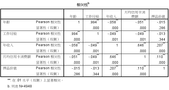 (2)相关性分析:由相关性矩阵和散点图可以看出,年龄与年收入(r=-0.058,p=0.000<0.05)以及月均信用卡消费额(r=-0.051,p=0.000<0.05)之间的相关性较弱;工作经验与年龄具有较高的正相关性(r=0.994,p=0.000<0.05),而与年收入(r=-0.049,p=0.001<0.05)和月均信用卡消费额(r=-0.049,p=0.001<0.05)之间的相关性较弱;年收入越高,月均信用卡消费额(r=0.646,p=0.000<0.05)和押品价值(r=0.207,p=0.000<0.05)的上限越高。